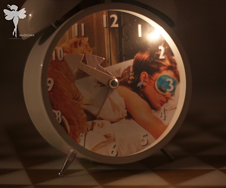 Bardzo spodobał mi się ten kadr ze Śniadania u Tiffan’ego. Przerobiłam go i wykadrowałam na rozmiar mojego budzika, Potem wydrukowałam, wycięłam i wystarczyło przykleić obrazek na miejsce wcześniejszego, ale najpierw trzeba było to wszystko porozkręcać i to była najbardziej wymagająca praca przy całym tym projekcie. Mój zegarek ma mnóstwo kabelków i w pewnym momencie przy odkręcaniu śrubki niechcący pociągnęłam za jeden z nich… na szczęście nic się nie przerwało, a zegarek nadal działa, ale strachu trochę było.